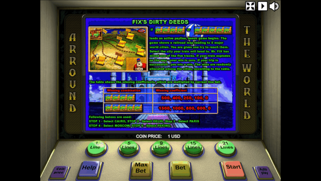 Игровой автомат Around The World был выпущен компанией Microgaming. В игре пять барабанов, есть простые и специальные символы, а также бонусные опции. Максимальный приз, который может получить игрок, составляет 10000 ставок. В виртуальный автомат Вокруг Света можно сыграть в казино онлайн без регистрации. Также пользователи могут опробовать и другие бесплатные игровые автоматы.