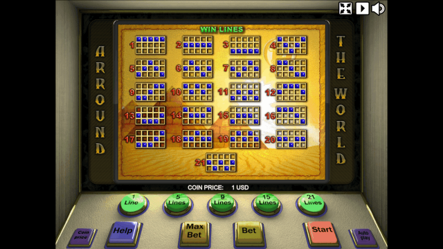 Around The World – это слот с пятью барабанами. Для ставок доступно двадцать линий. На линию можно поставить от 1 до 10 монет. Максимальная ставка на одно вращение будет составлять 200 монет. В начале игры пользователь получает на счет 2000 монет, если играет в автомат в деморежиме. Далее можно выбрать размер ставки и запустить вращения барабанов.