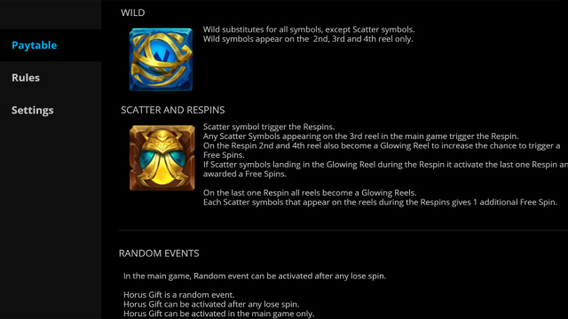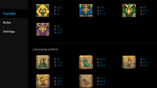 В слоте девять базовых символов. Необходимое число картинок для формирования выигрышной комбинации и коэффициенты указаны во вкладке «Выплаты». К низкооплачиваемым символам относятся изображения ибиса, шакала, птицы, льва и змеи. Эти картинки приносят на счет геймера от 0,1 до 3 кредитов. Среди высокооплачиваемых символов – голова быка, кобра, лев с синей гривой и сокол. Эти знаки позволяют пополнить баланс на сумму от 0,8 до 20 кредитов. Око Гора – Дикий символ, выпадающий только на втором, третьем и четвертом барабанах. Вайлд не формирует комбинаций, но может встать на замену любой базовой картинки. Второй специальный символ Скаттер (золотой жук-скарабей) также не наделен коэффициентами, но запускает бонусные раунды.